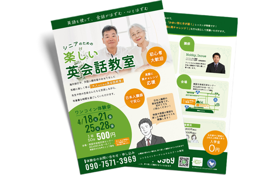 英会話教室の新聞折込チラシを制作しました。 高齢者向けのため、文字数を大きめにするよう気をつけました。
